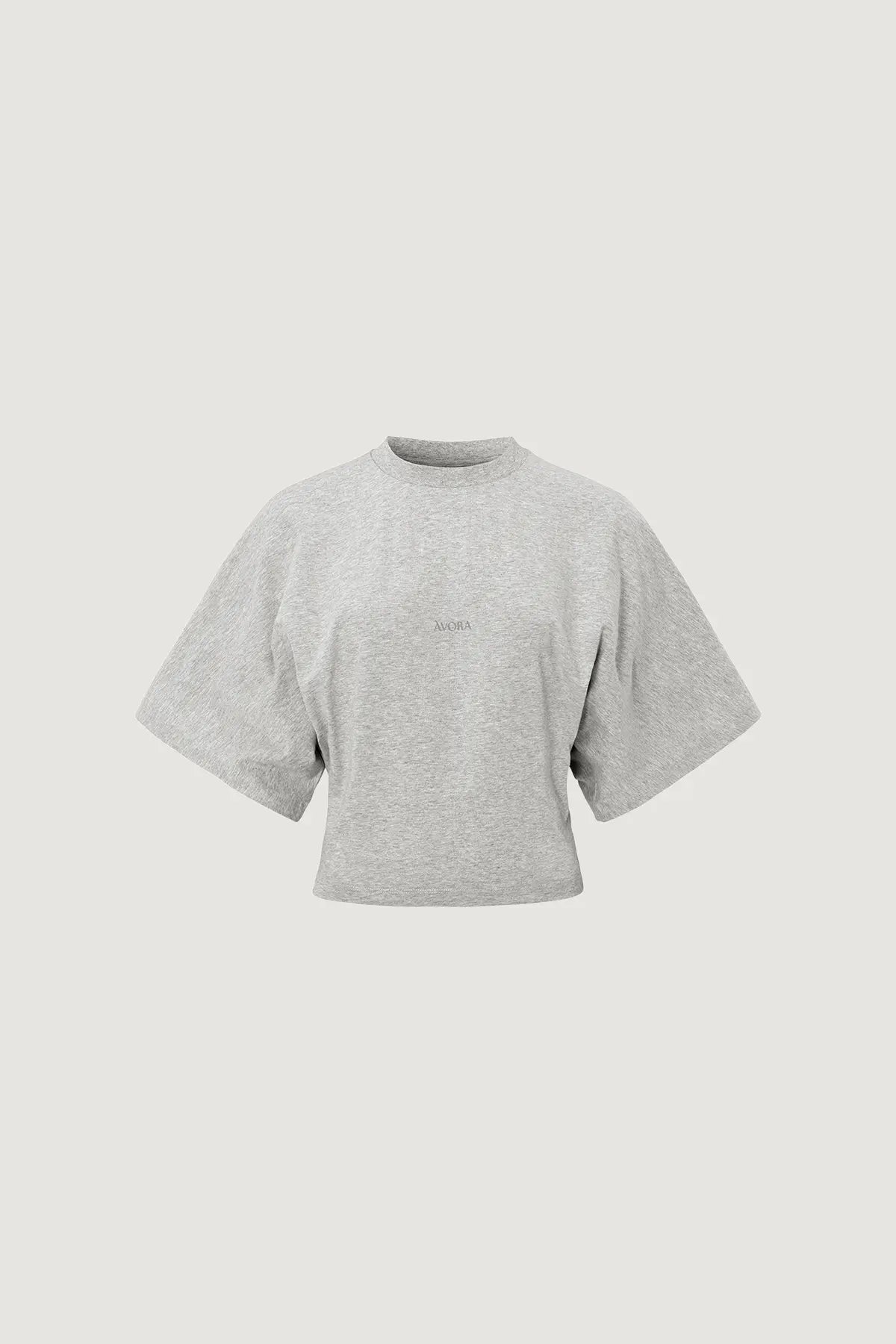 The DNA Tee, a genuine ÀVORA classic, showcases a subtle logo on the chest. It has a high neckline, cinched waist, and wide sleeves.