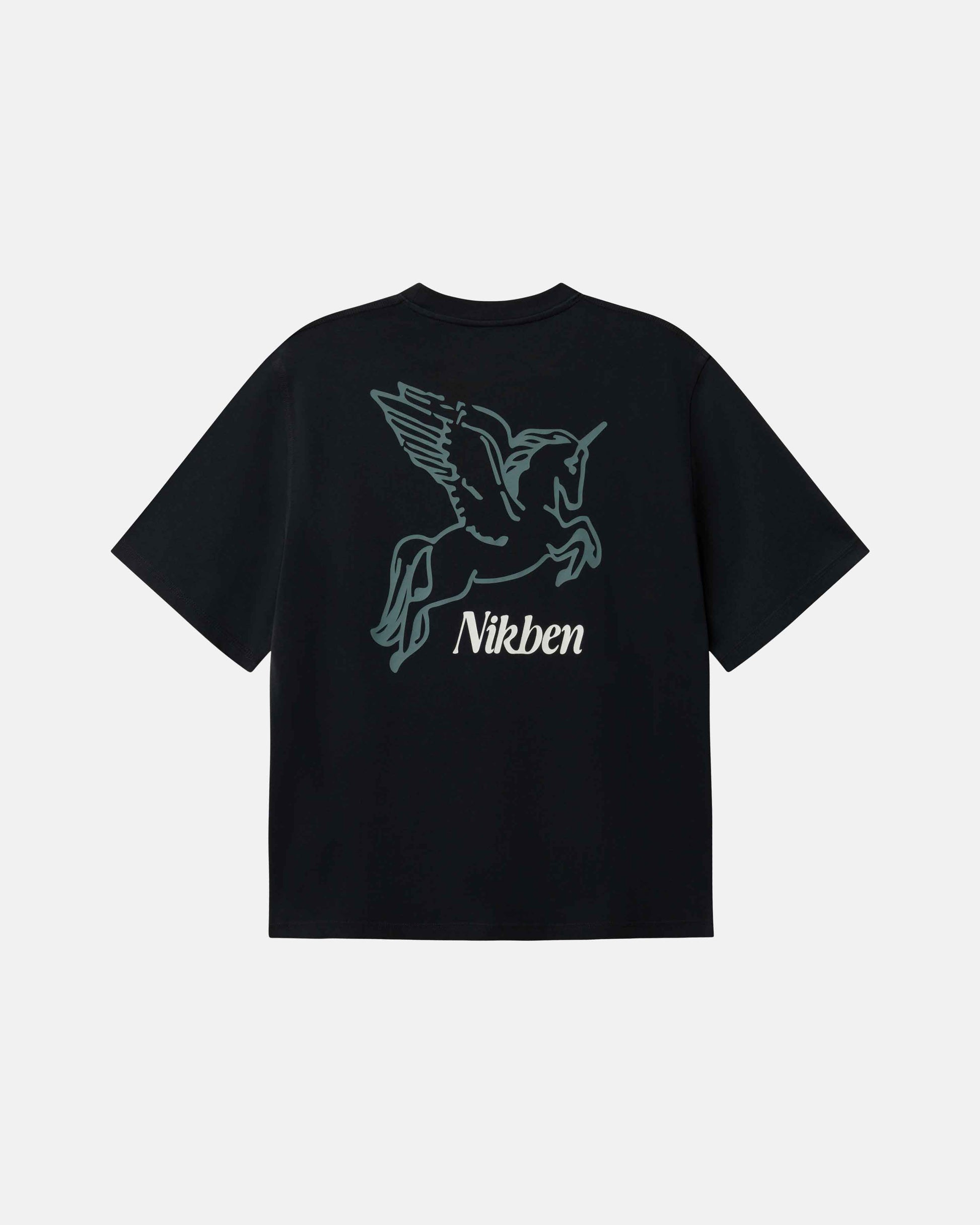 Fantasy Tee är tillverkad av 100 % ekologisk bomull. Denna svarta t-shirt har en avslappnad, boxig passform med ton-i-ton-sömmar och har ett Nikben-texttryck på bröstet och ett stort enhörningstryck på ryggen.