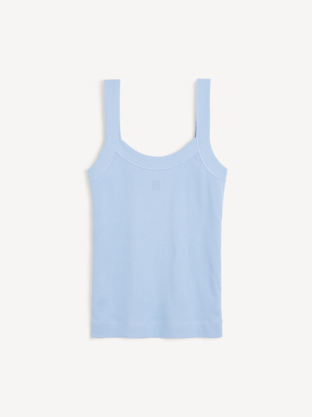 Made in an organic cotton mix with stretch, the easy silhouette falls from wide straps and has a low round neckline. With a small, embroidered monogram on its front.